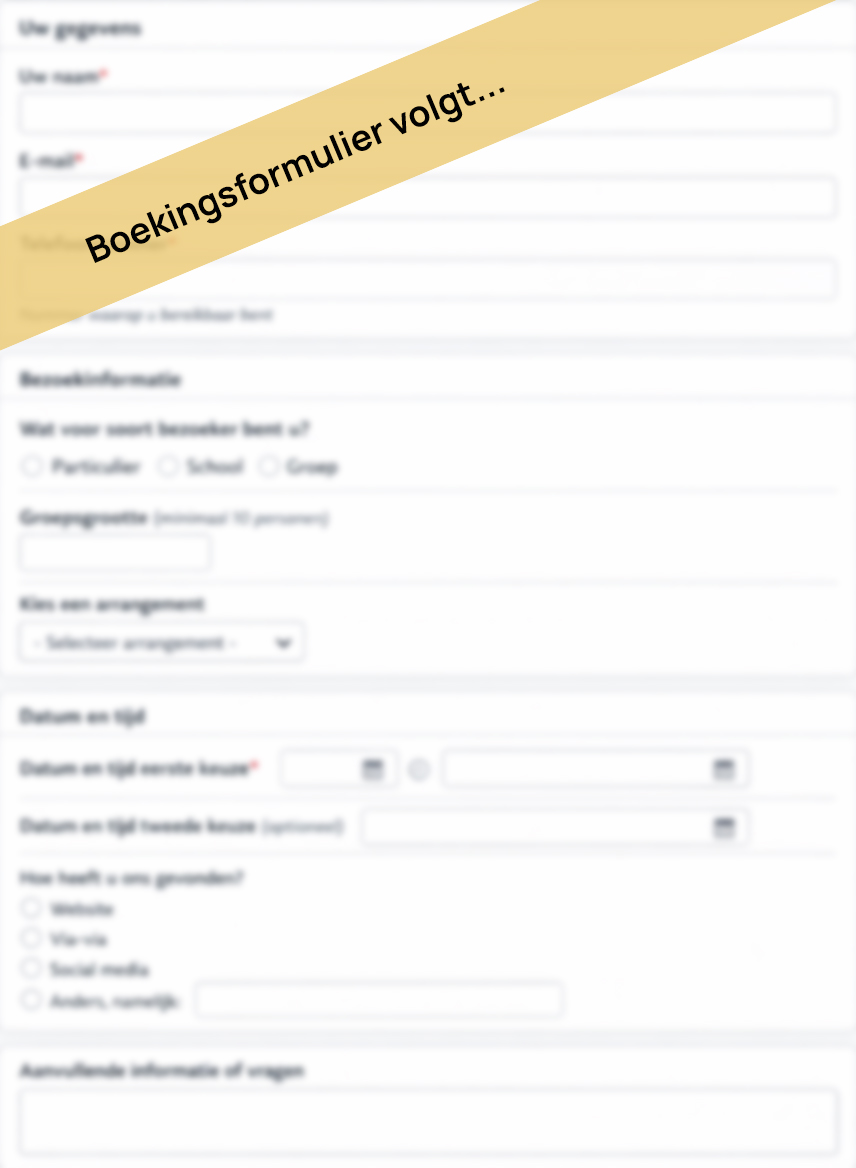 Wil je met een groep ons mooie museum bezoeken en eventueel gebruik maken van een arrangement, vul dan onderstaand boekingsformulier in. Onze planningsafdeling neemt daarna zo snel mogelijk contact met je op om verdere details te bespreken.