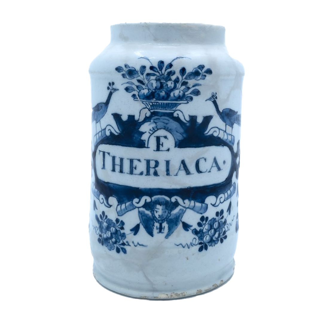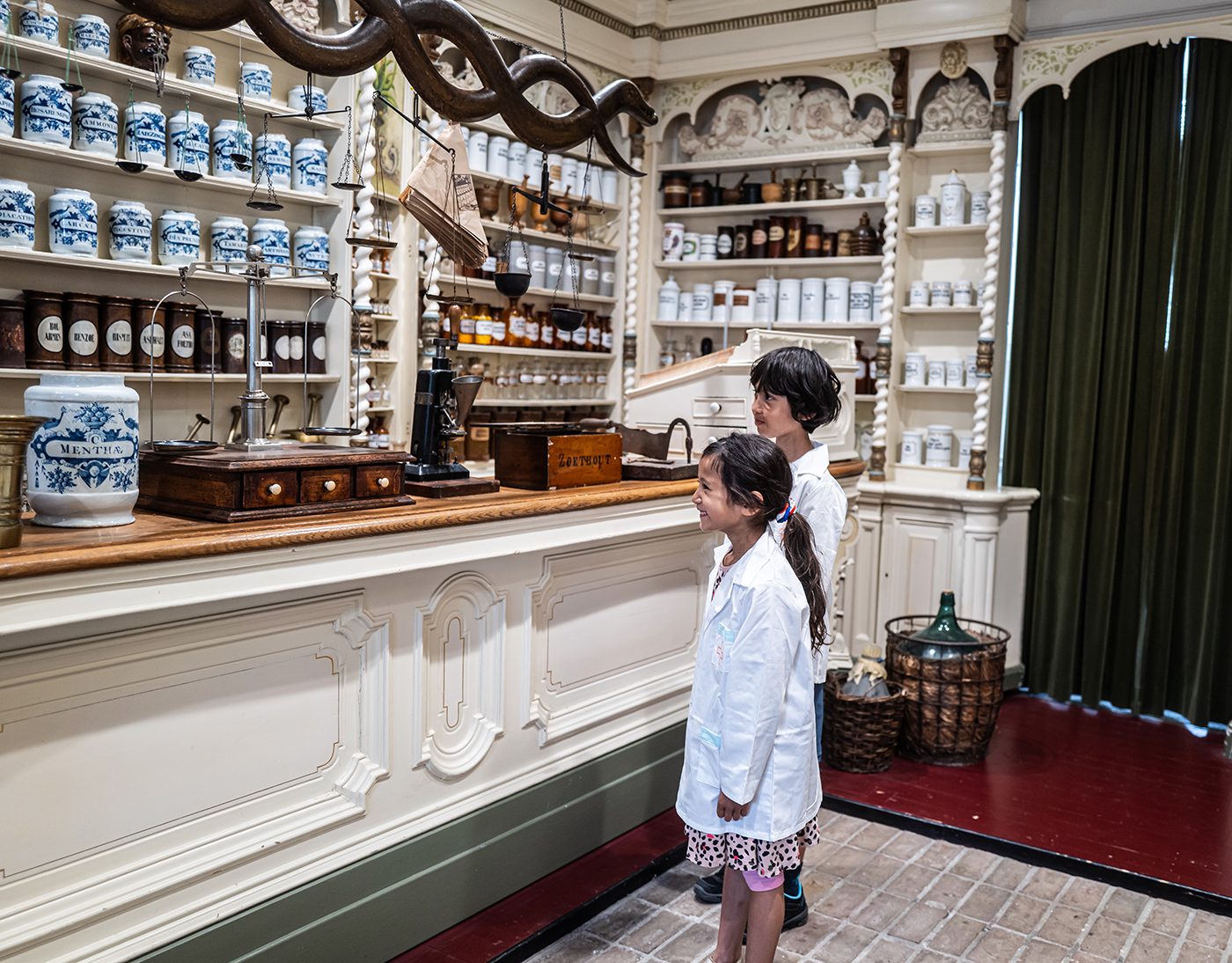 Onze fraaie apothekerskast is in 1786 gebouwd en stond in het plaatsje Heusden. Het is een uitbundig versierde wandkast in empirestijl met gedraaid hout, veel bladgoud, met maar liefst 92 laatjes waarop in Latijnse opschriften de inhoud staat beschreven, met schildjes met geneeskrachtige planten erop. De pilaren zijn versierd met engeltjes en leeuwen. Alle bezoekers zeggen hetzelfde: een pronkstuk!
