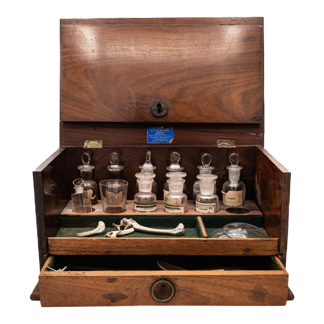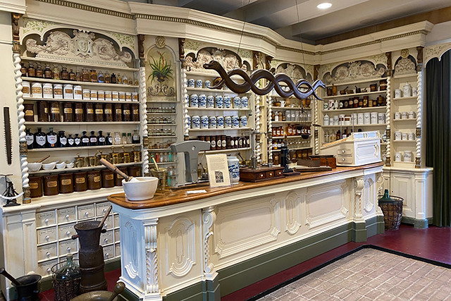 Onze fraaie apothekerskast is in 1786 gebouwd en stond in het plaatsje Heusden. Het is een uitbundig versierde wandkast in empire-stijl met gedraaid hout, veel bladgoud, met maar liefst 92 laatjes waarop in Latijnse opschriften de inhoud staat beschreven, met schildjes met geneeskrachtige planten erop en kopjes van engeltjes en leeuwen.